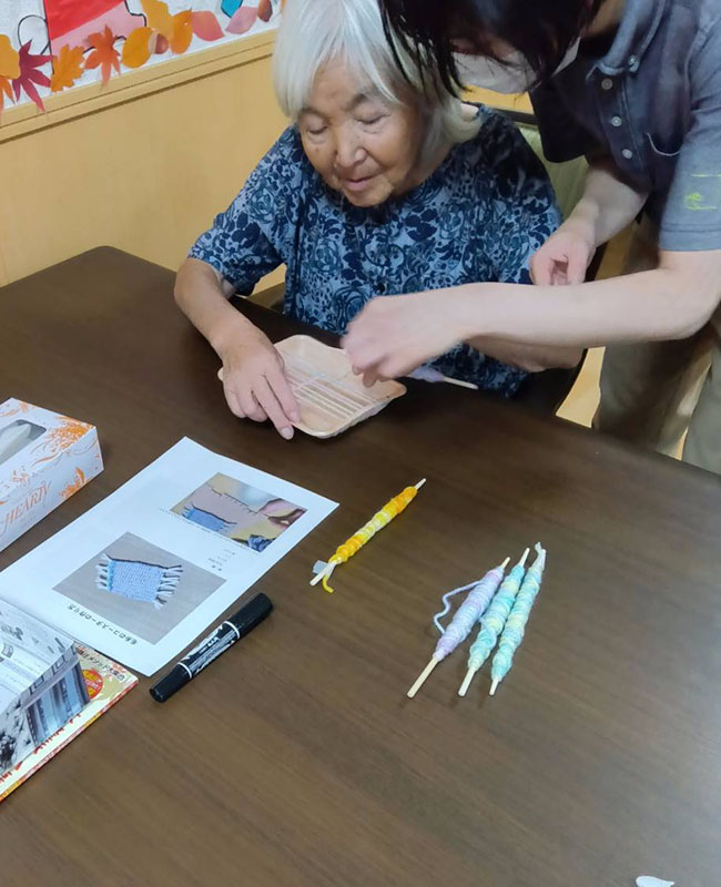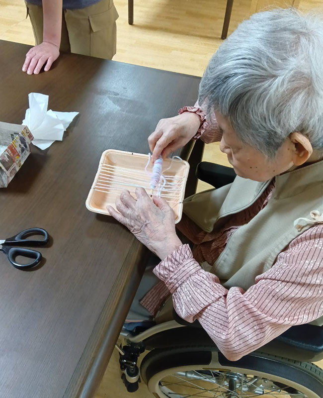 食品トレーに毛糸を巻いて、割りばしに毛糸をくるくる巻いた道具で編んでいく、ちょっとユニークな編み方です!