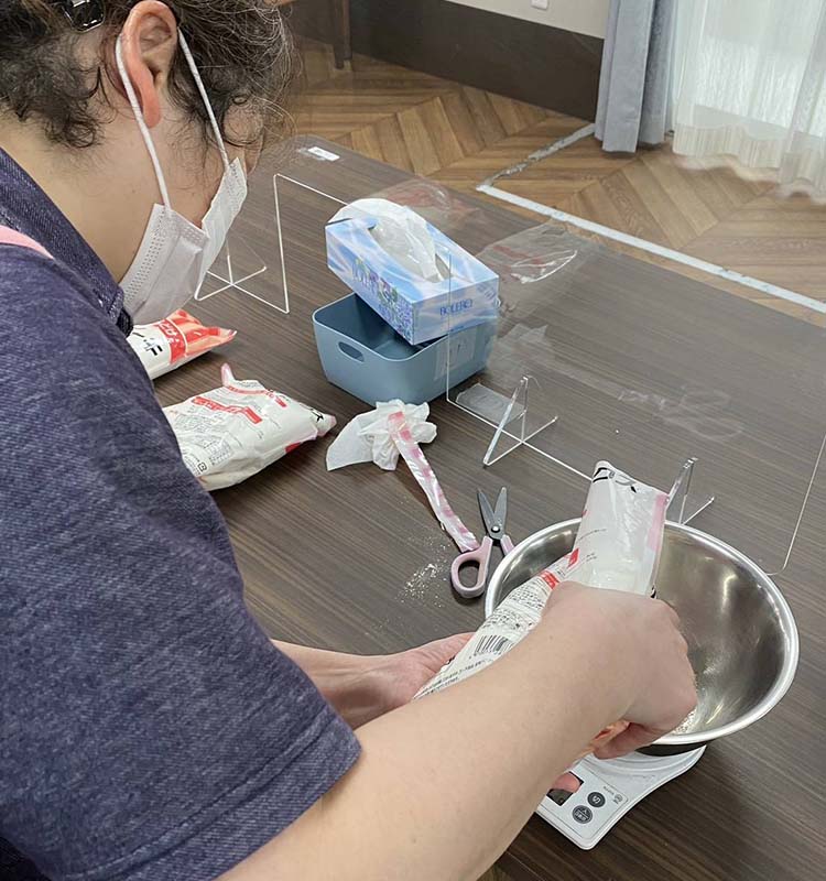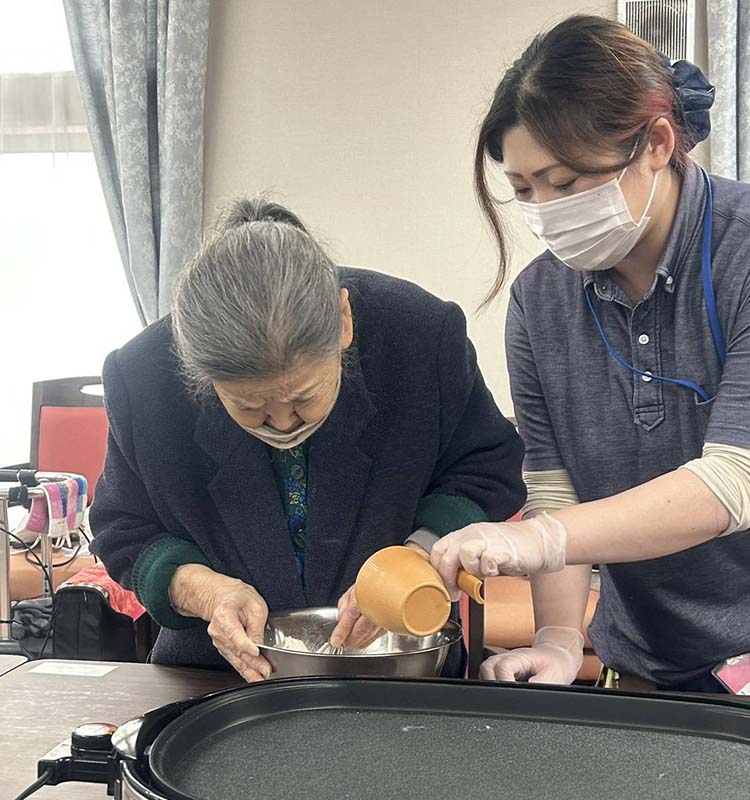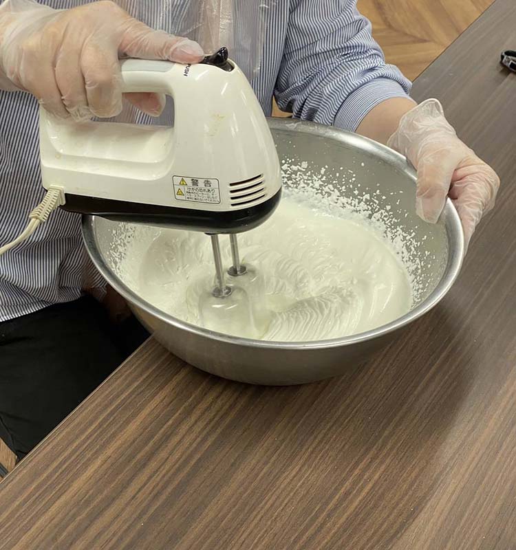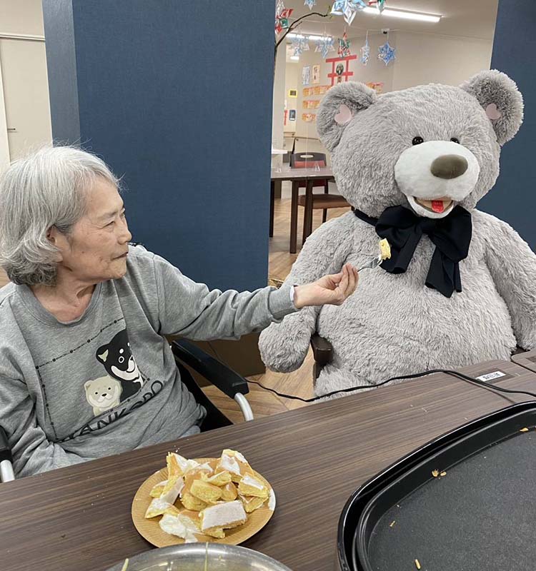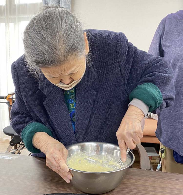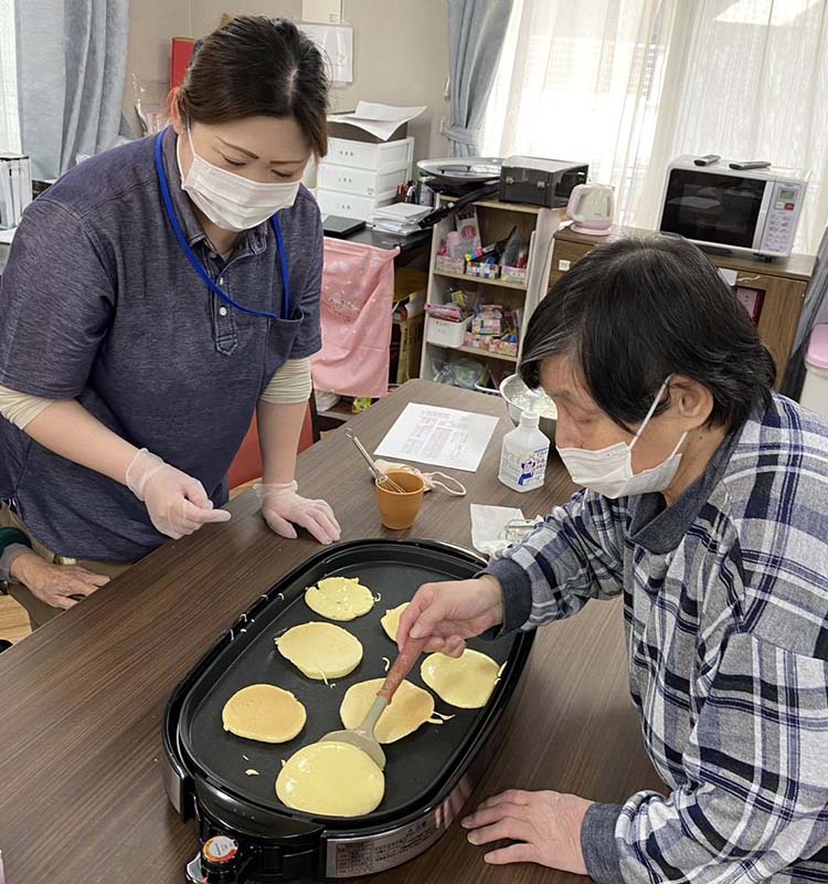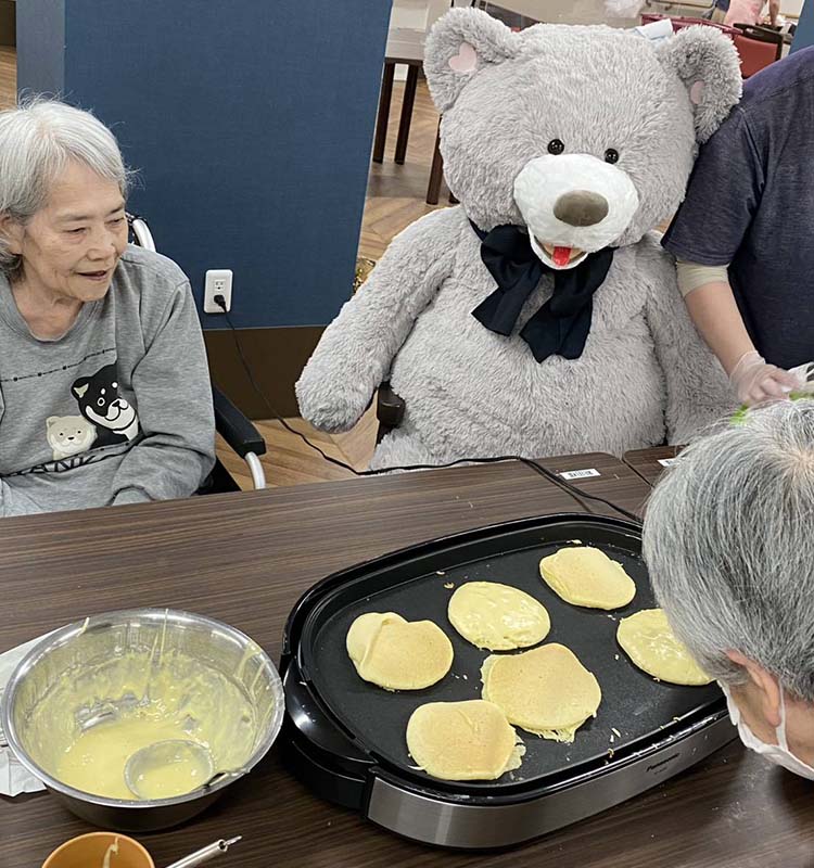 作っている最中「早く食べたい!待てない…」と仰っていた利用者様はあんこと生クリームがのったホットケーキを食べると「美味しい〜☺️」と素敵な笑顔を見せてくれました!