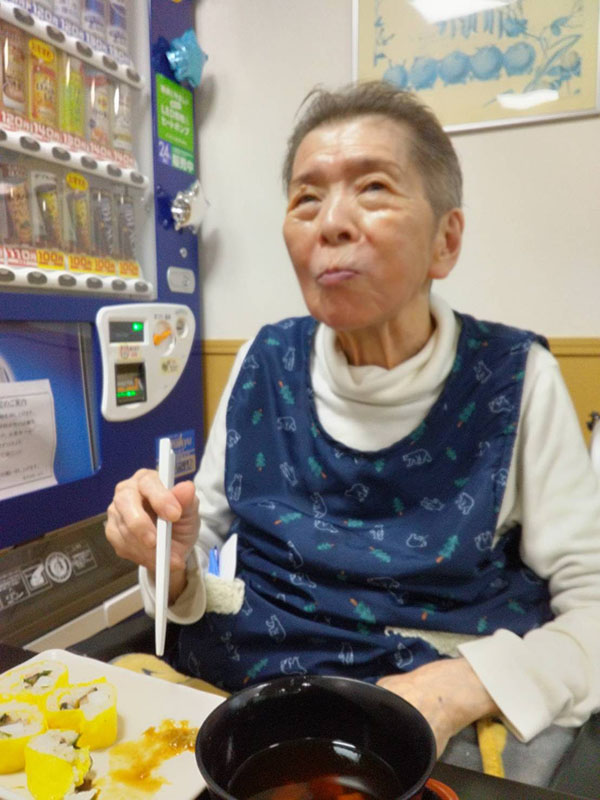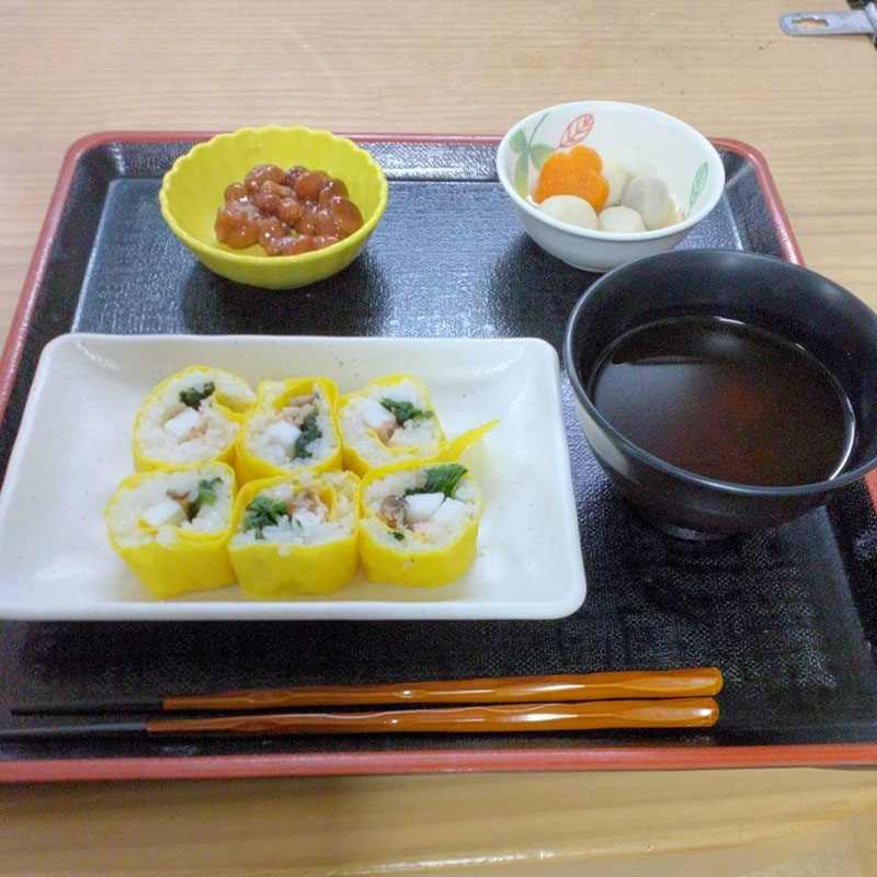 ロイヤルフーズさんが朝から卵巻きずしを作ってくださっている様子や、昼食前の皆さまの様子(お写真)です。